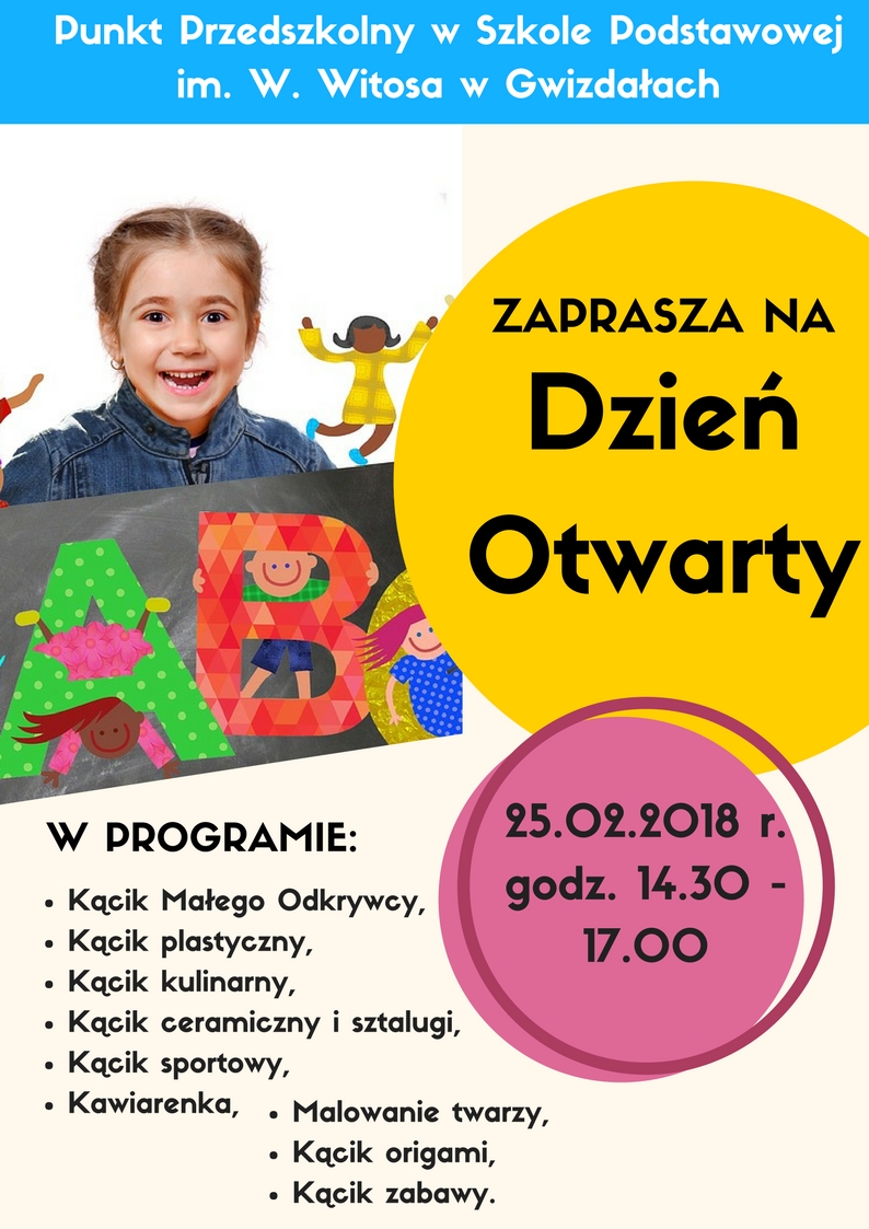 Społeczność Szkoły Podstawowej im. Wincentego Witosa w Gwizdałach serdecznie zaprasza na Dzień Otwarty.
