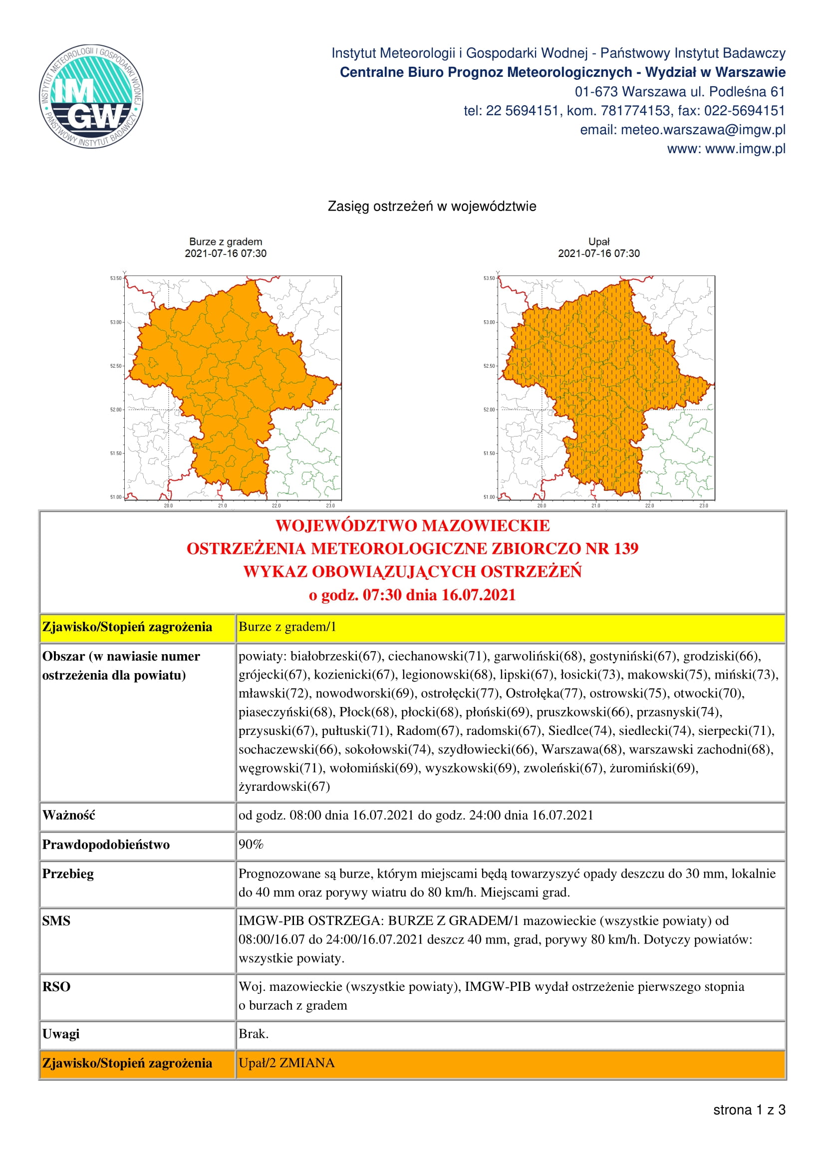 OSTRZEŻENIA METEOROLOGICZNE ZBIORCZE NR 136 DLA WOJEWÓDZTWA MAZOWIECKIEGO