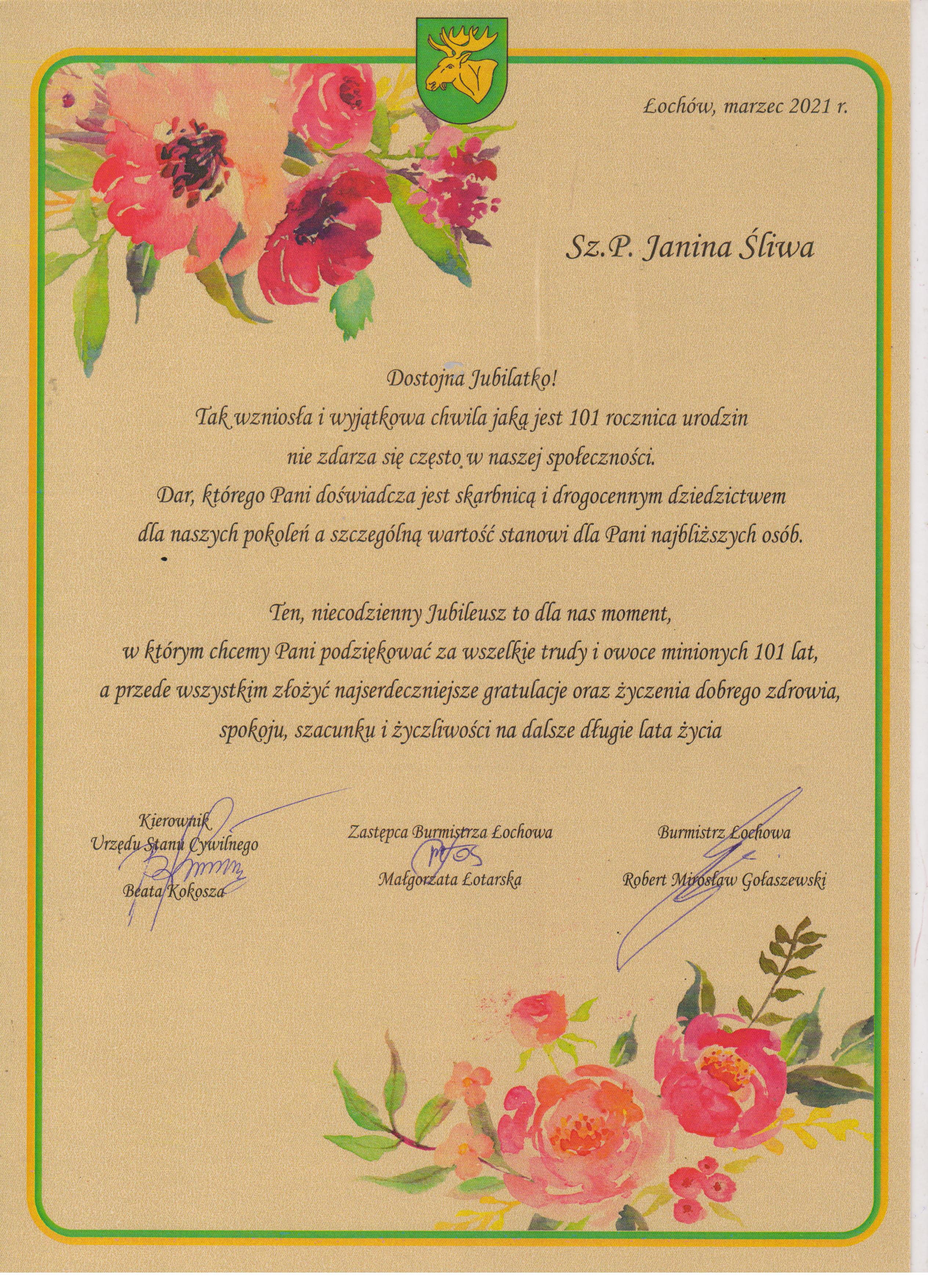Z ogromną radością informujemy, iż w dniu dzisiejszym tj.15 marca - Jubileusz 101 urodzin obchodzi mieszkanka naszej Gminy P. Janina Śliwa z domu Drózda. Władze samorządowe Gminy Łochów pamiętały o wyjątkowym Jubileuszu. Kierownik Referatu Spraw Obywatelskich i USC Kokosza Beata w imieniu Burmistrza Łochowa i wszystkim mieszkańców Gminy odwiedziła Jubilatkę i złożyła życzenia urodzinowe, wręczając bukiet kwiatów, list gratulacyjny oraz kosz słodkości. Bukiet kwiatów sprawił Jubilatce największą, nieskrywaną radość, wywołując uśmiech na jej twarzy. P. Janina całe swoje życie związała z pracą na roli i wychowaniem dzieci /doczekała się z mężem Stanisławem 3 synów i 2 córek/. Obecnie Szanowna Jubilatka przebywa pod troskliwą opieką syna i synowej Elżbiety w Łochowie.
