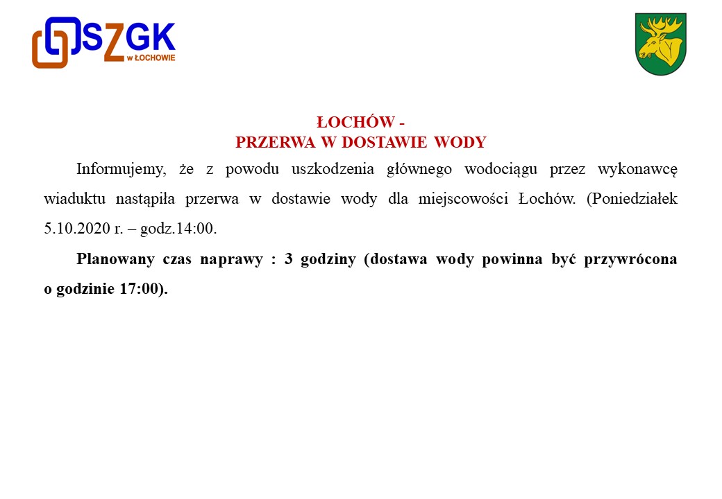 30 września 2020 r. (Środa) w godzinach 8:00 do 14:00 w miejscowości Jasiorówka nastąpi przerwa w dostawie wody z wodociągu (spowodowana pracami przy budowie wiaduktu). Za utrudnienia przepraszamy.