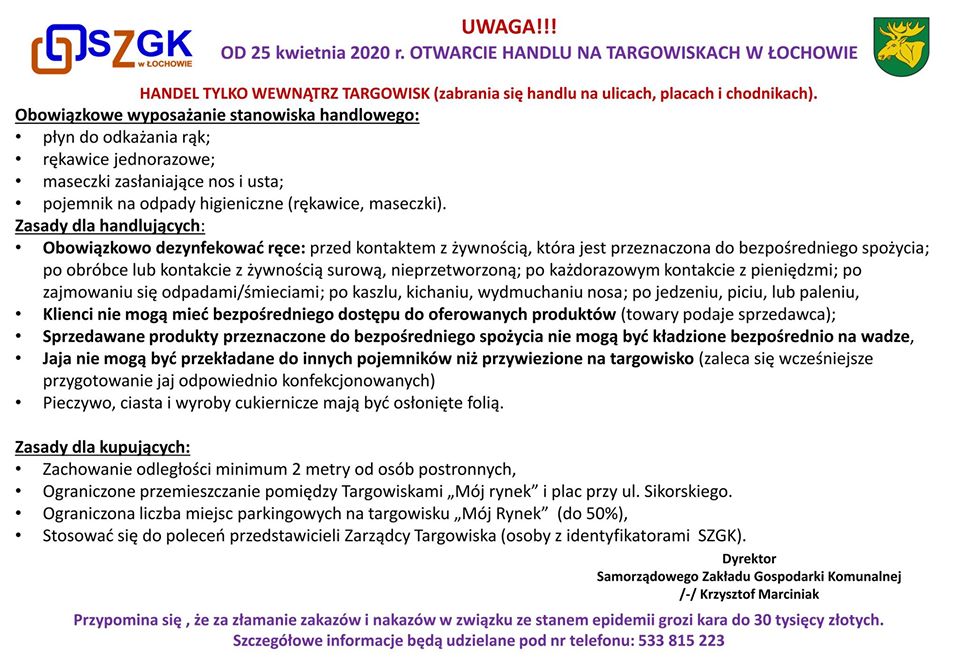 na podstawie Rozporządzenia Rady Ministrów w sprawie ustanowienia określonych ograniczeń, nakazów i zakazów w związku z wystąpieniem stanu epidemii z dnia 19 kwietnia 2020 roku (Dz.U.z 2020 r. poz.697), od dnia 22 kwietnia do odwołania, zadania wykonywane przez Urząd Miejski w Łochowie  będą  w dalszym ciągu wykonywane z ograniczeniem  obsługi interesantów.