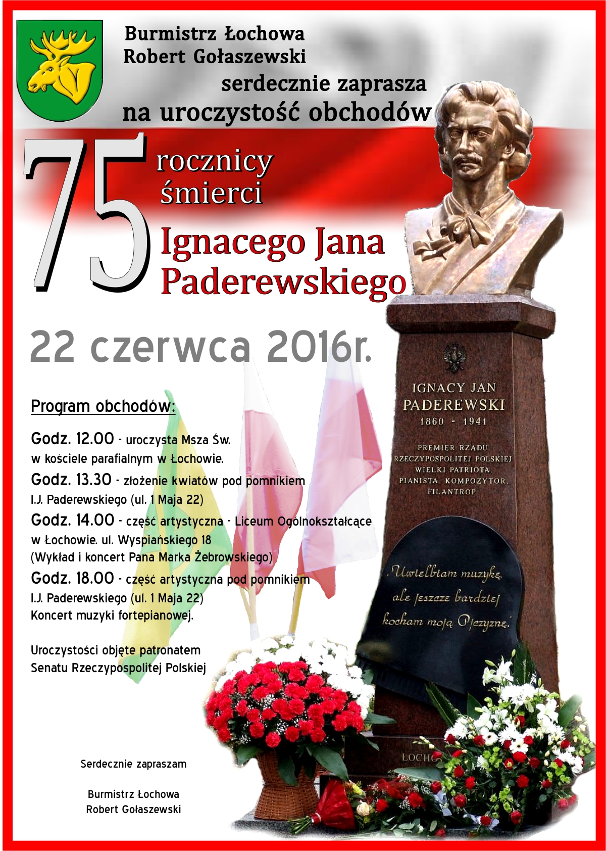 Burmistrz Łochowa Robert Gołaszewski serdecznie zaprasza dnia 22 czerwca 2016r. na uroczystość obchodów 75 rocznicy śmierci Ignacego Jana Paderewskiego.