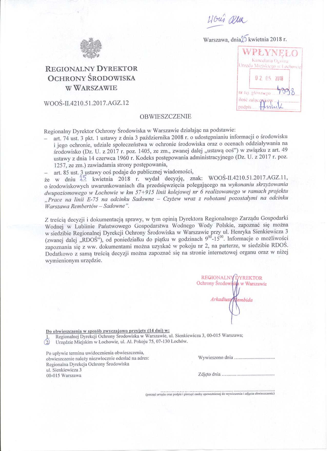 Obwieszczenie Regionalnego Dyrektora Ochrony Środowiska w Warszawie