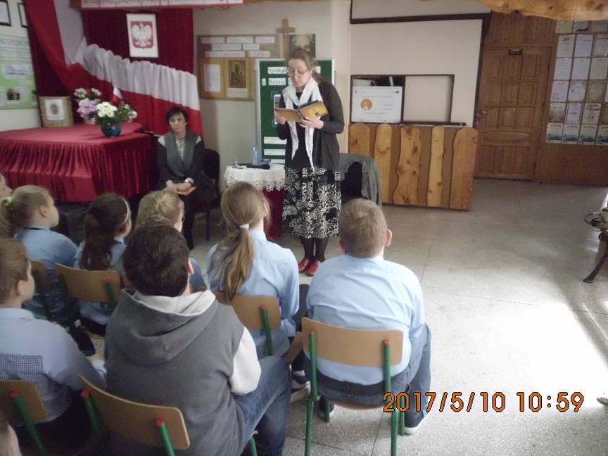 Z tej okazji dnia 10.05.2017r. w Katolickiej Publicznej Szkole Podstawowej im. H. i I.J Paderewskich w Kaliskach odbyło się spotkanie autorskie z Panią Renatą Piątkowska autorką książek dla dzieci. Pisarce towarzyszyła lektorka Pani Malwina Kożurno.