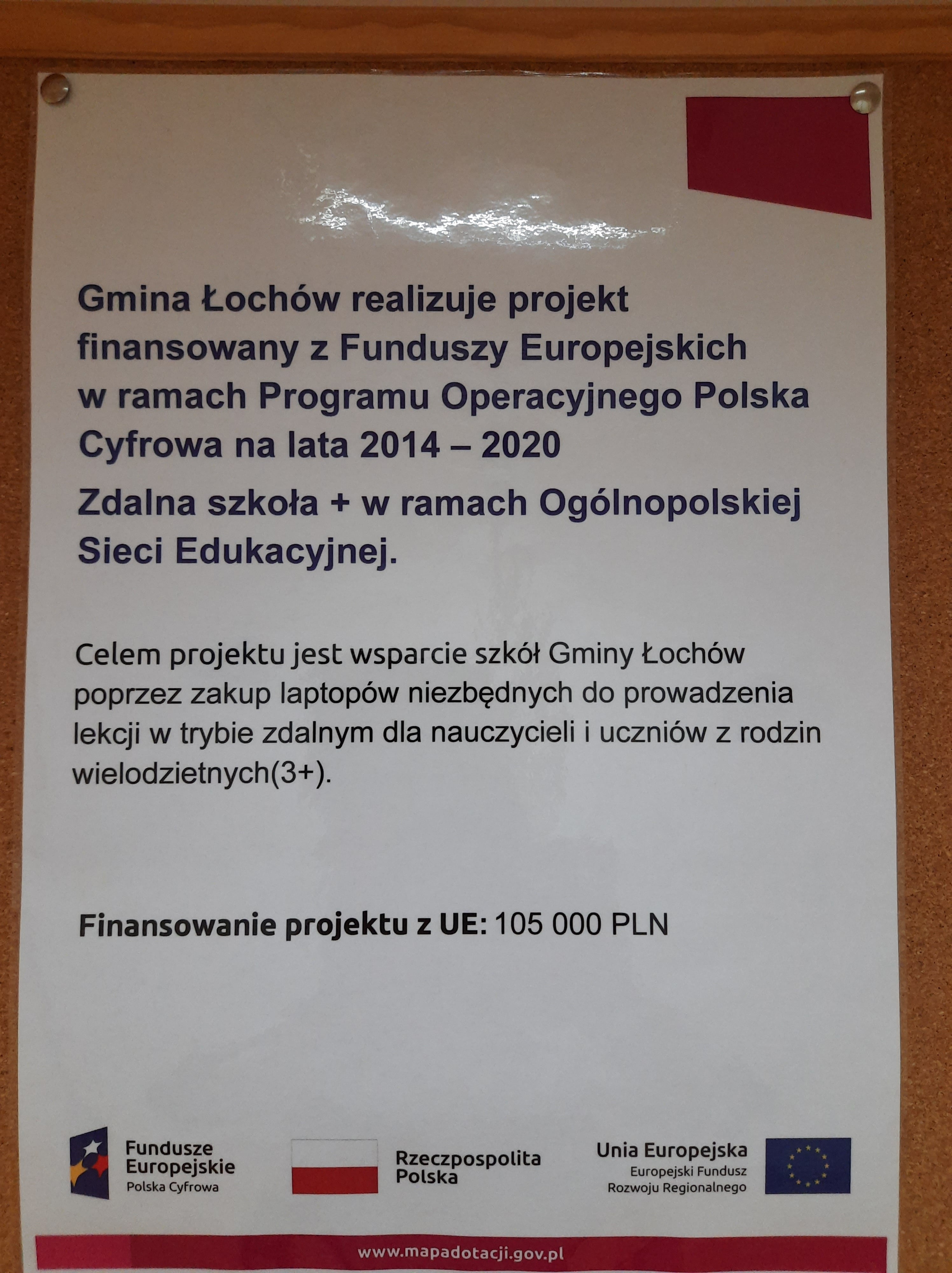 Celem projektu jest wsparcie szkół Gminy Łochów poprzez zakup laptopów niezbędnych do prowadzenia lekcji w trybie zdalnym dla nauczycieli i uczniów z rodzin wielodzietnych (3+).