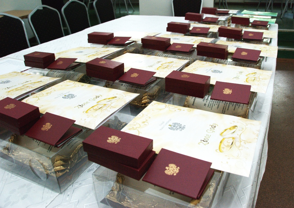Już od samego początku o miłą atmosferę Jubileuszu zadbała „Kapela Łochowska” przygrywając biesiadne melodie. Uroczystość zorganizowano dla uhonorowania zgodnego pożycia małżeńskiego zaproszonych par, które mimo wielu przeciwności życiowych dotrzymały przyrzeczeń małżeńskich sprzed ponad pół wieku. Jubilaci przyjęli z rąk Burmistrza P. Roberta Gołaszewskiego medale przyznane im przez Prezydenta RP za długoletnie pożycie małżeńskie. Małżonkowie otrzymali legitymacje, dyplomy i pamiątkowe księgi okolicznościowe. Całość dopełniały bukiety czerwonych róż. Były serdeczne życzenia i gratulacje od przedstawicieli władz samorządowych. Jubilat odśpiewano przy akompaniamencie „Kapeli Łochowskiej” gromkie „100 lat” oraz nagrodzono ich burzą oklasków.