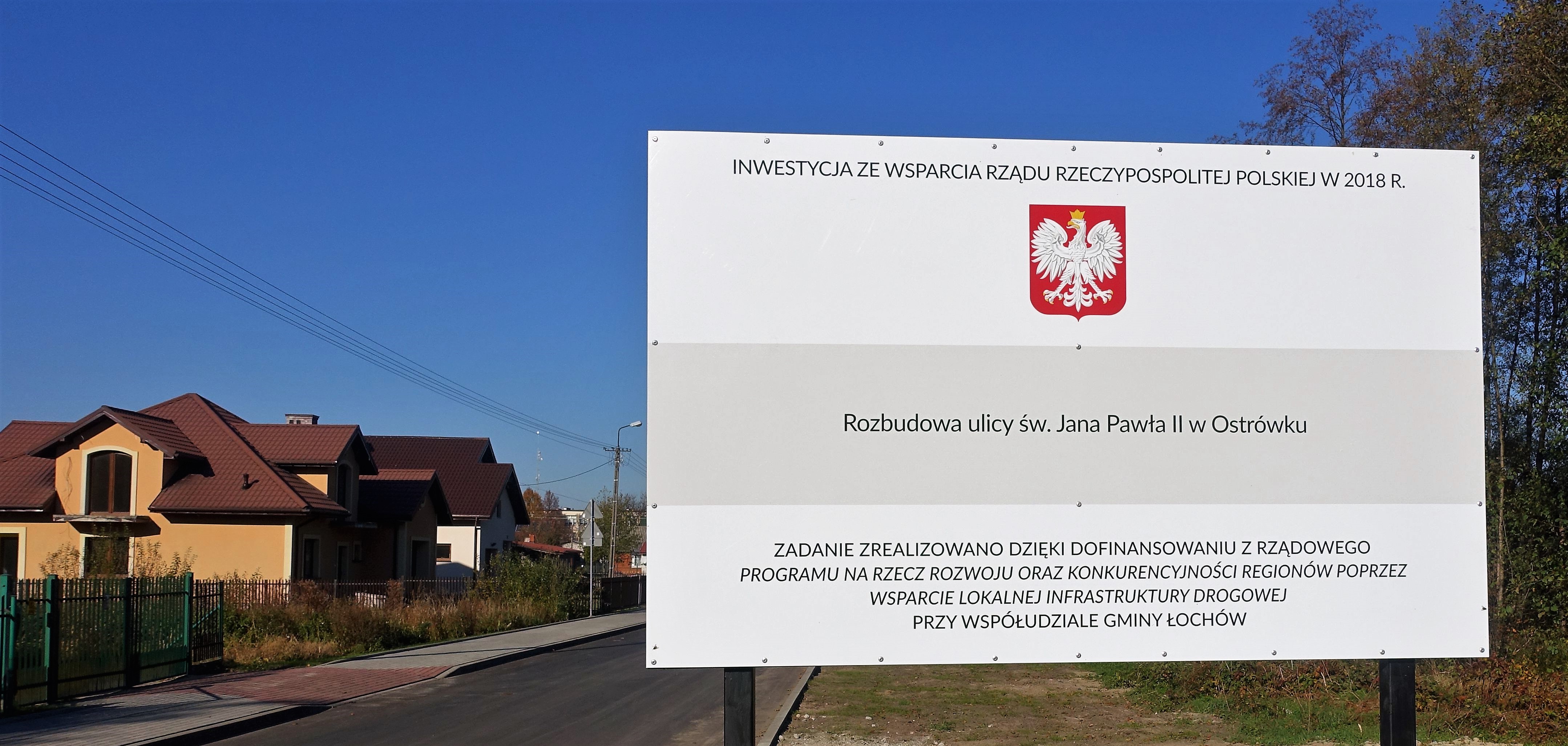 „Rozbudowa ulicy Św. Jana Pawła II w Ostrówku ”, dofinansowana w ramach „Rządowego Programu na rzecz Rozwoju oraz Konkurencyjności Regionów poprzez Wsparcie Lokalnej Infrastruktury Drogowej”, zgodnie z umową o udzielenie dotacji nr BRI-II.805.7.2.2018 zawartą 8 października 2018 roku.