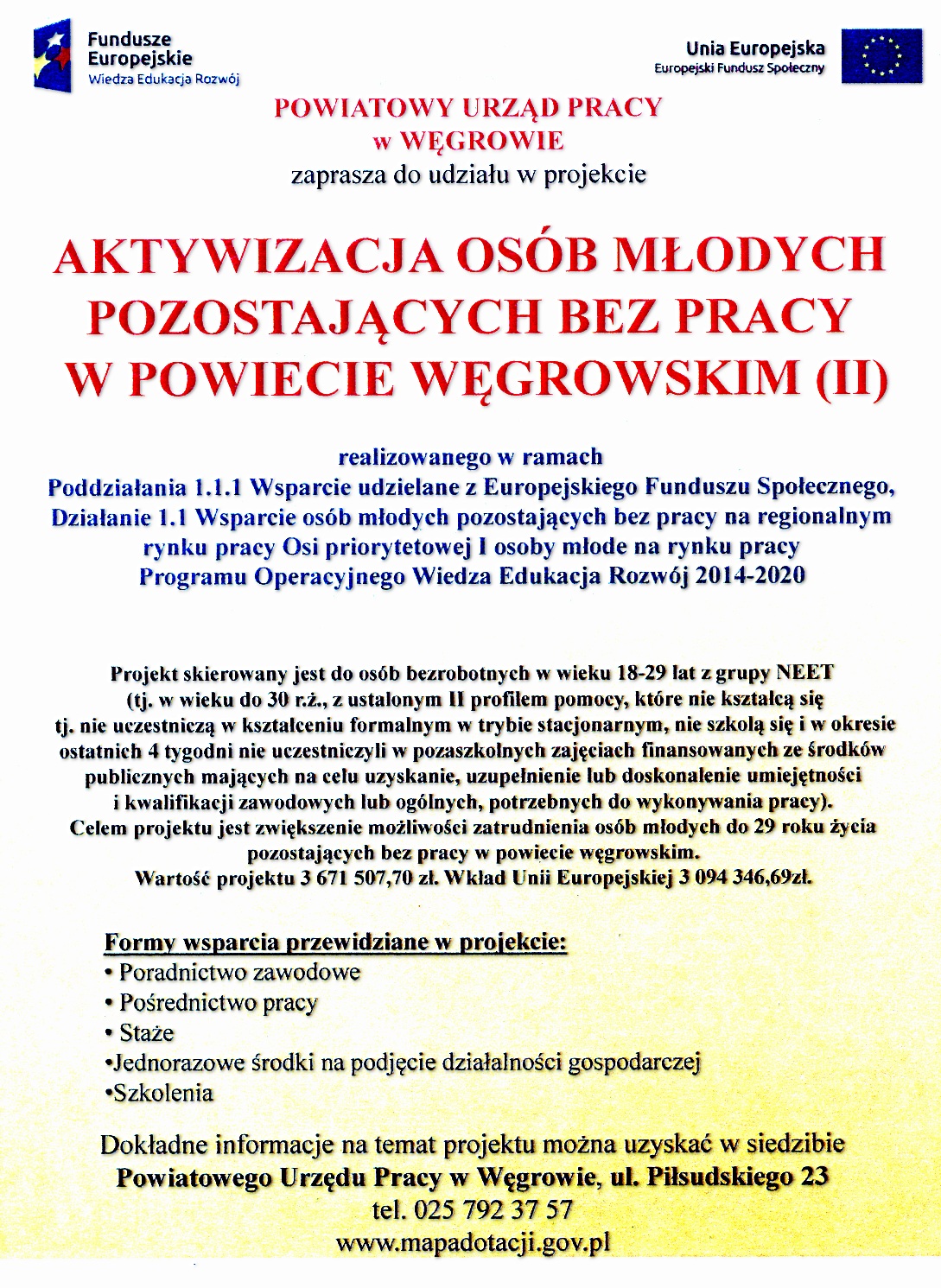 Projekt skierowany jest do osób bezrobotnych w wieku 18-29 lat z grupy NEET (tj. w wieku do 30 r.ż., z ustalonym II profilem pomocy, które nie kształcą się tj. nie uczestniczą w kształceniu formalnym w trybie stacjonarnym, nie szkolą się i w okresie ostatnich 4 tygodni nie uczestniczyli w pozaszkolnych zajęciach finansowanych ze środków publicznych mających na celu uzyskanie, uzupełnienie lub doskonalenie umiejętności i kwalifikacji zawodowych lub ogólnych, potrzebnych do wykonywania pracy). Celem projektu jest zwiększenie możliwości zatrudnienia osób młodych do 29 roku życia pozostających bez pracy w powiecie węgrowskim. Wartość projektu 3 671 507,70 zł. Wkład Unii Europejskiej 3 094 346,69zł.