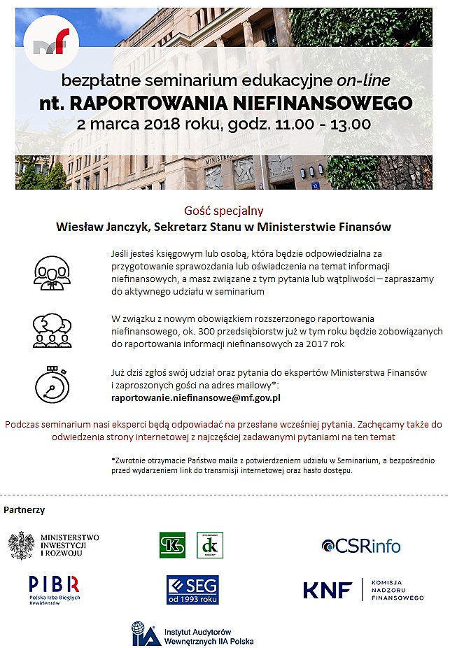 Zapraszamy również do przesyłania pytań naszym ekspertom na adres: raportowanie.niefinansowe@mf.gov.pl. Pytania te zostaną omówione podczas panelu dyskusyjnego w czasie seminarium i opublikowane na stronie internetowej MF.