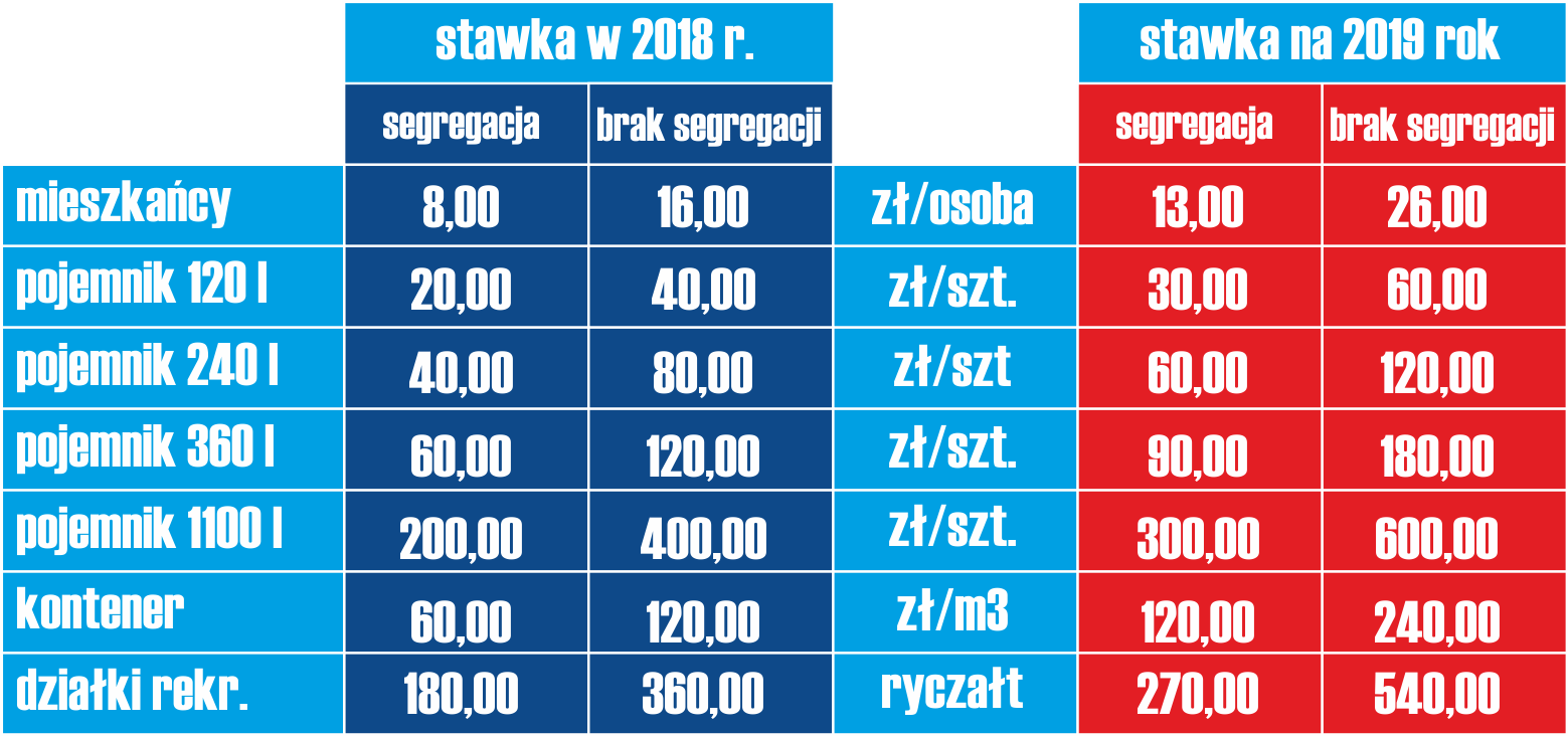 Najniższa oferta z drugiego przetargu przewyższa blisko 80% wartość oferty z roku 2015. Powoduje to konieczność podniesienia stawki opłaty za gospodarowanie odpadami komunalnymi segregowanymi na 13,00 zł od osoby. Rada Miejska zdecydowała o utrzymaniu zniżek dla rodzin wielodzietnych (posiadających Karty Dużej Rodziny), dla których opłata miesięczna wyniesie 10,00 zł od osoby.