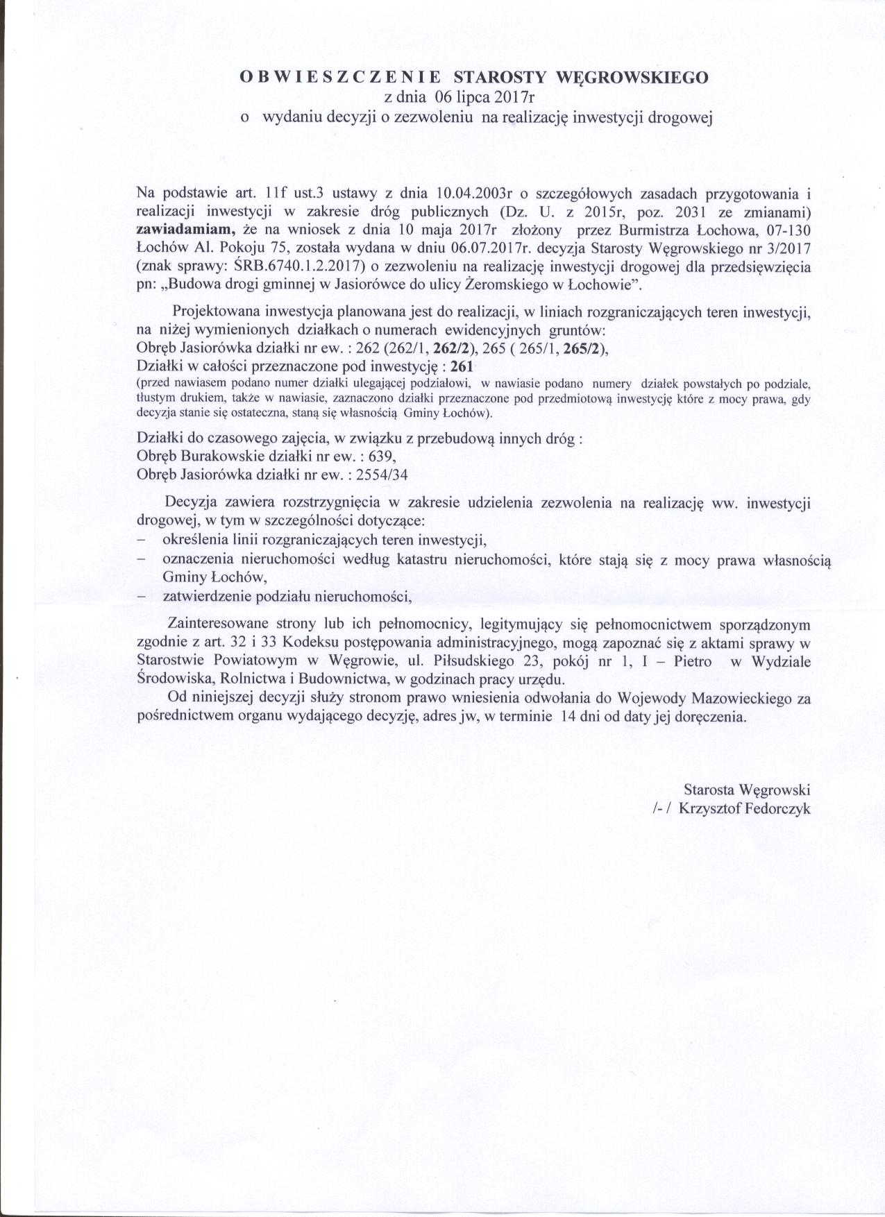 OBWIESZCZENIE STAROSTY WĘGROWSKIEGO