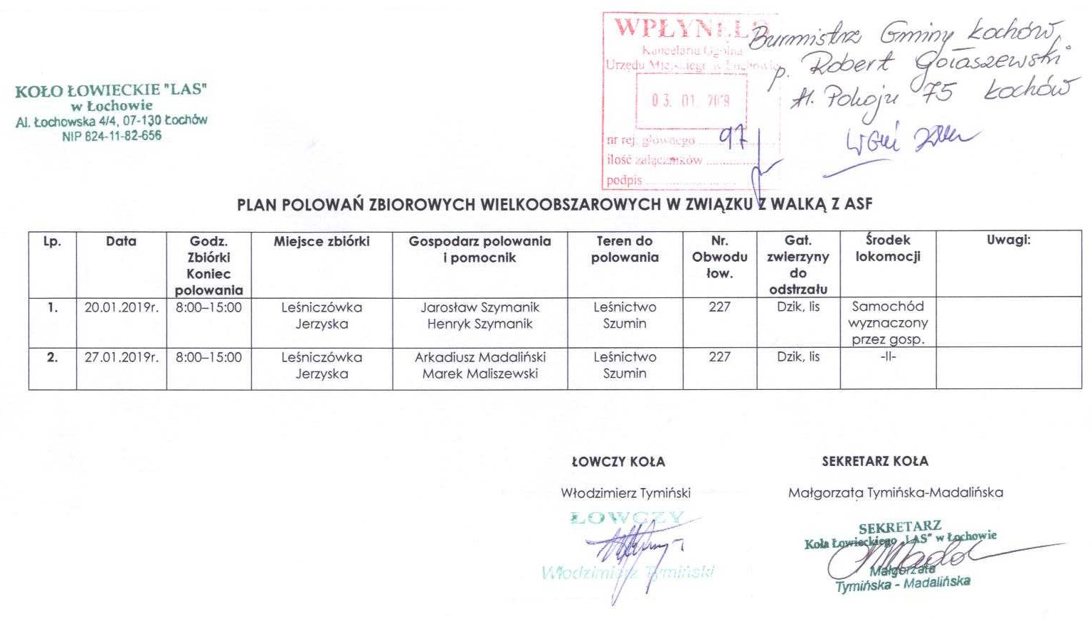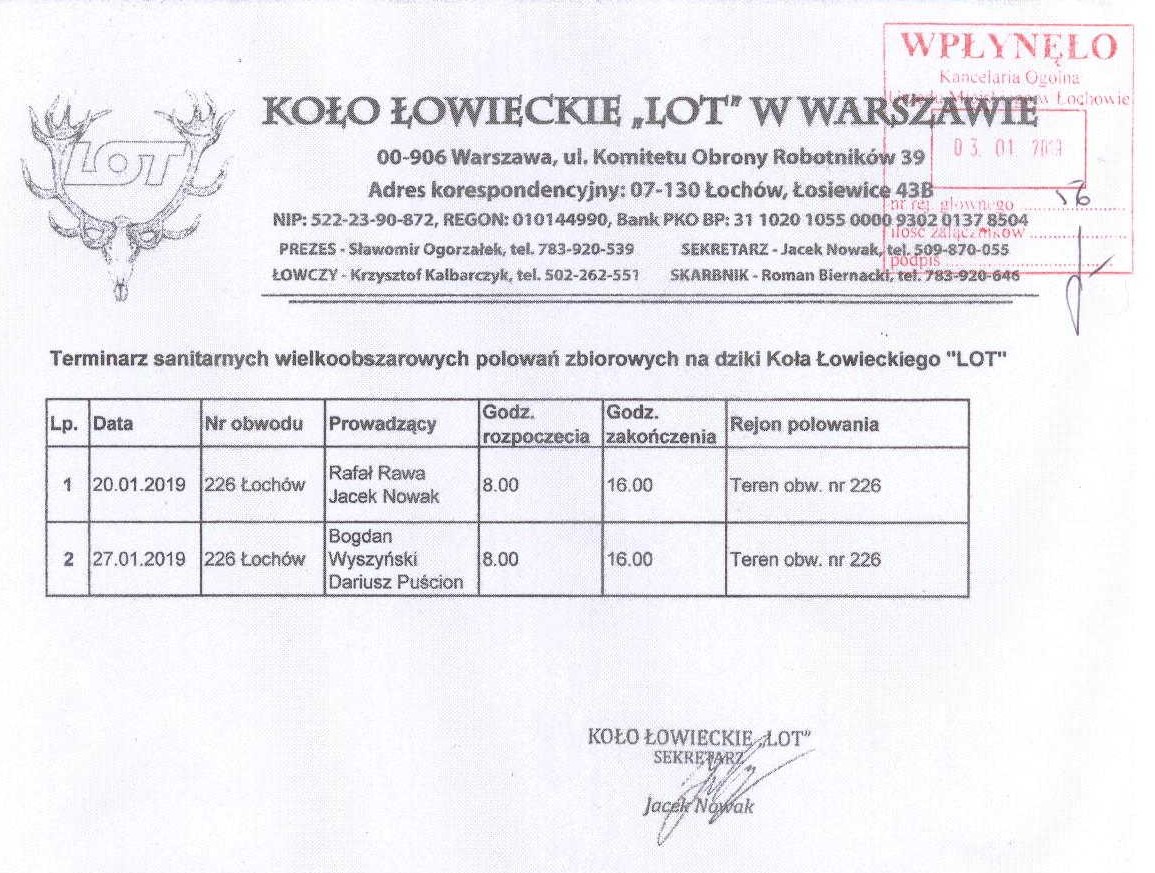 Zgodnie z zaleceniami Ministra Środowiska z dnia 28.12.2018r. w sprawie organizacji sanitarnych wielkoobszarowych zbiorowych na dziki, podajemy informację o terminarzu polowań na 2019r.