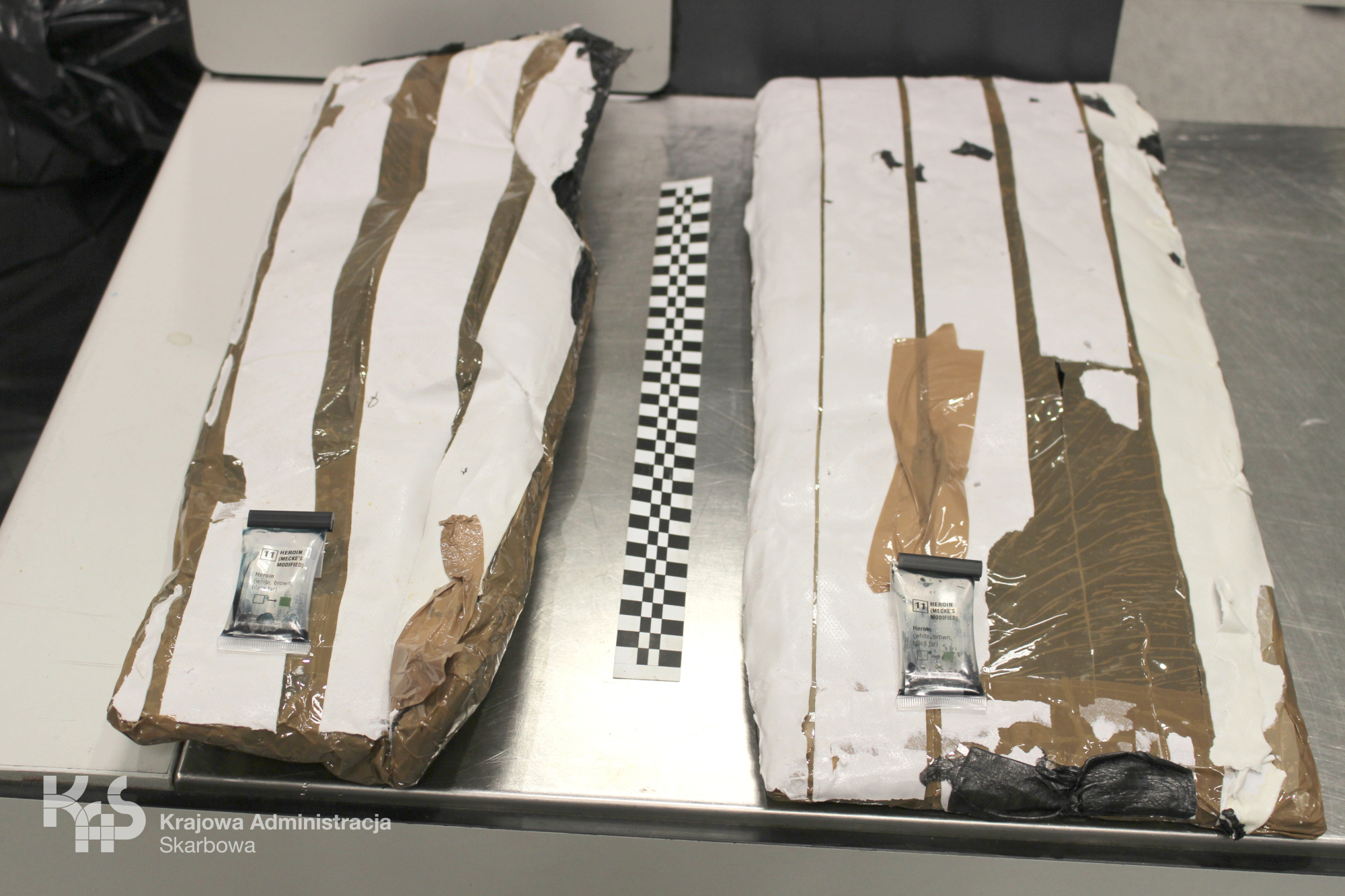 Po otwarciu bagaży pełnych ubrań, uwagę funkcjonariuszy zwróciła nienaturalna grubość spodu walizek. Pomiędzy ich ściankami w podwójnym dnie, ukryte były po dwie paczki oklejone folią i taśmą, zawierające granulat koloru beżowego. Wstępny wynik badania narkotestem jak i szczegółowe badania w Centralnym Laboratorium Celno-Skarbowym w Otwocku potwierdziły, że jest to heroina.