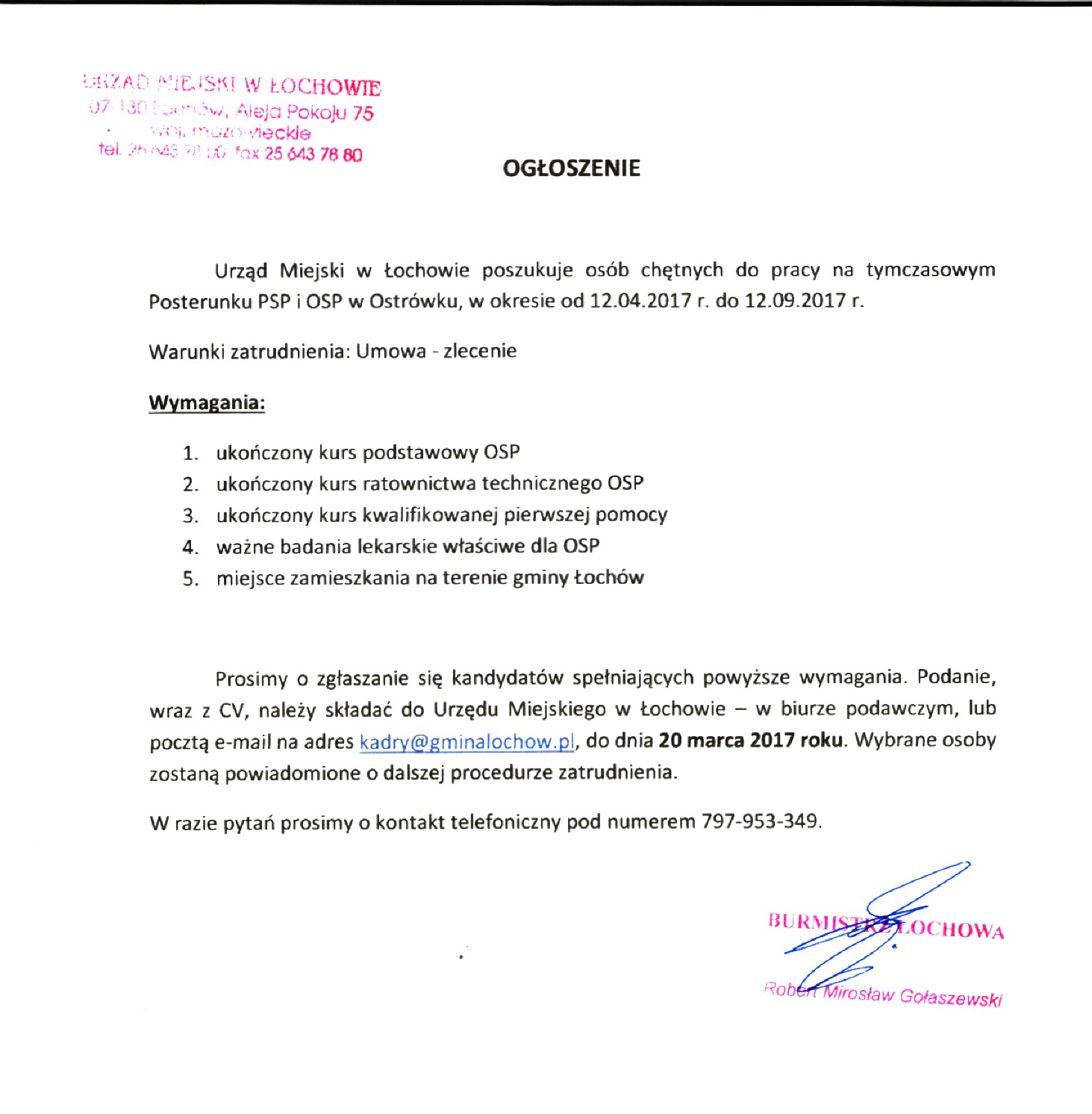 Prosimy o zgłaszanie się kandydatów spełniających powyższe wymagania. Podanie, wraz z CV, należy składać do Urzędu Miejskiego w Łochowie - w biurze podawczym, lub pocztą e-mail na adres kadry@gminalochow.pl, do dnia 20 marca 2017 roku. Wybrane osoby zostaną powiadomione o dalszej procedurze zatrudnienia.