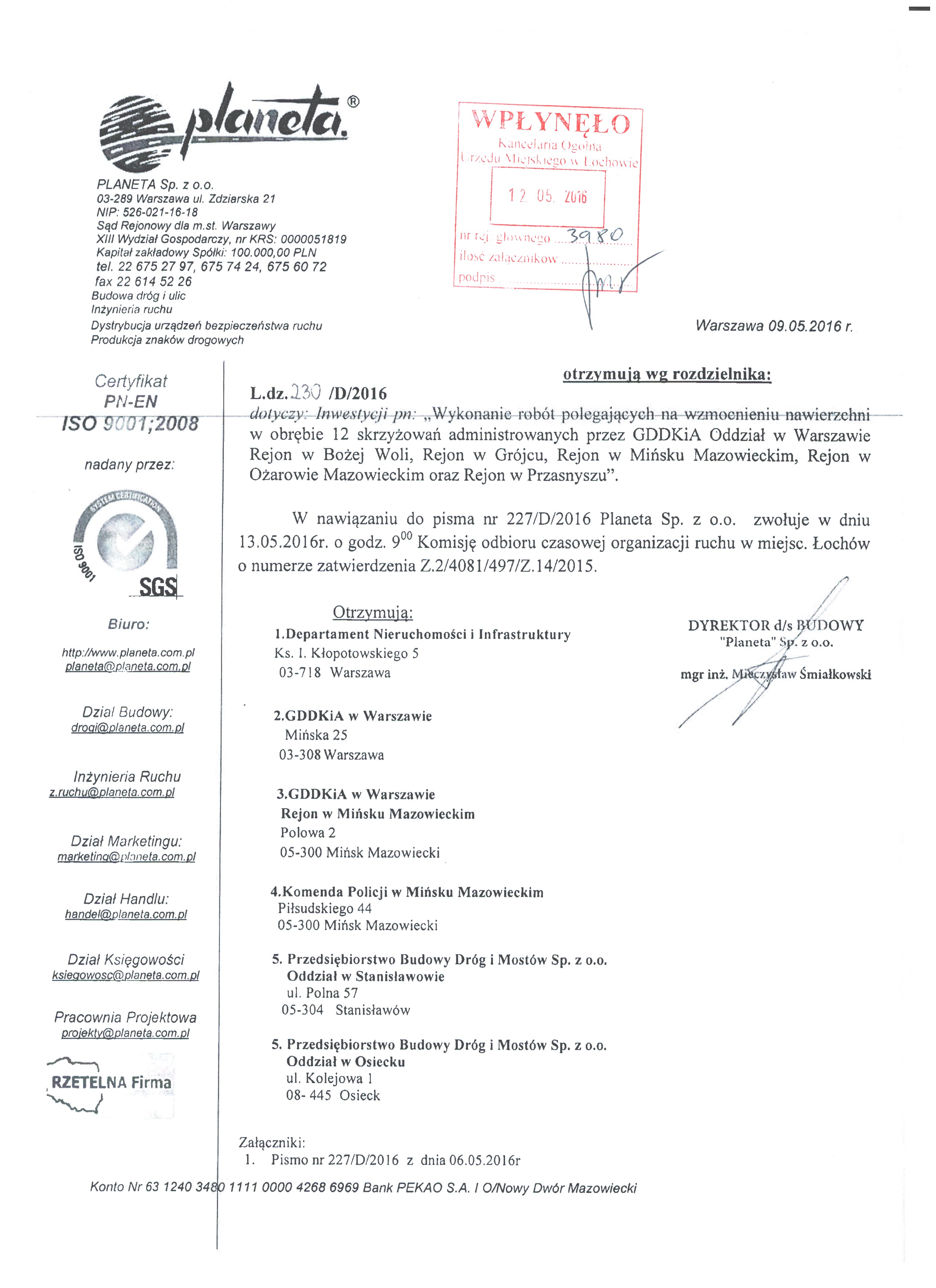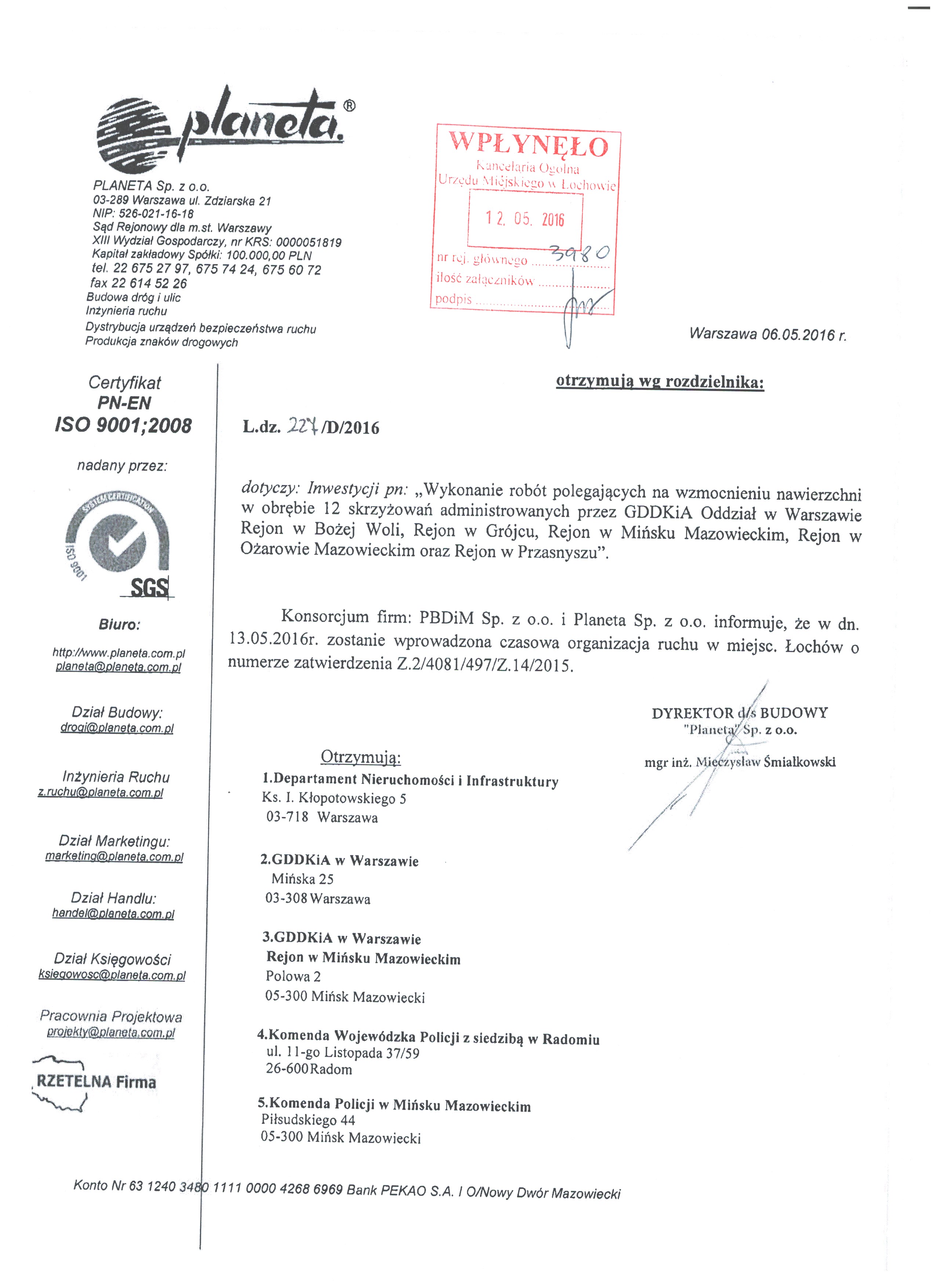 Gmina Łochów informuje, iż przekazana została w dniu dzisiejszym informacja o prowadzeniu od dnia 13.05.2016r. robót budowlanych polegających na remoncie ronda na skrzyżowaniu dróg nr 50 i nr 62.