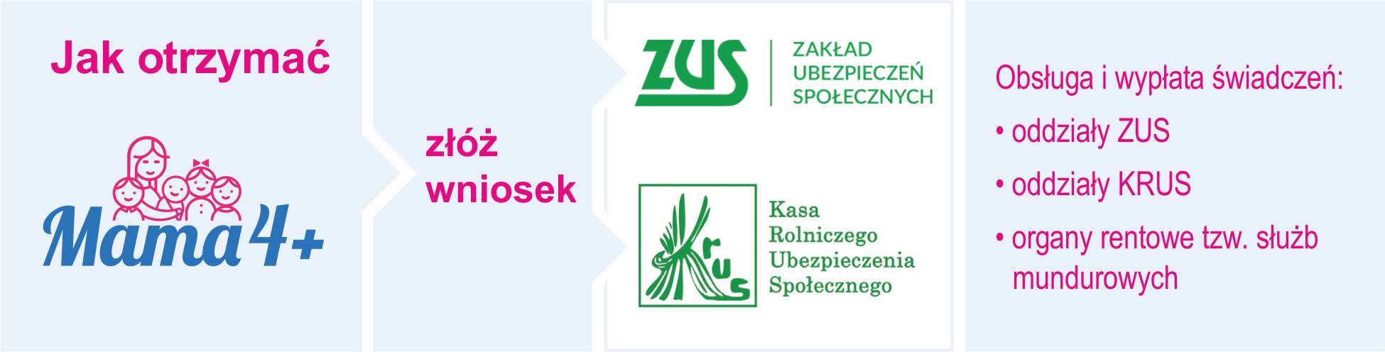 Obsługą i wypłatą świadczeń zajmować się będą oddziały Zakładu Ubezpieczeń Społecznych (ZUS), Kasy Rolniczego Ubezpieczenia Społecznego (KRUS) lub inne organy rentowe tzw. służb mundurowych.