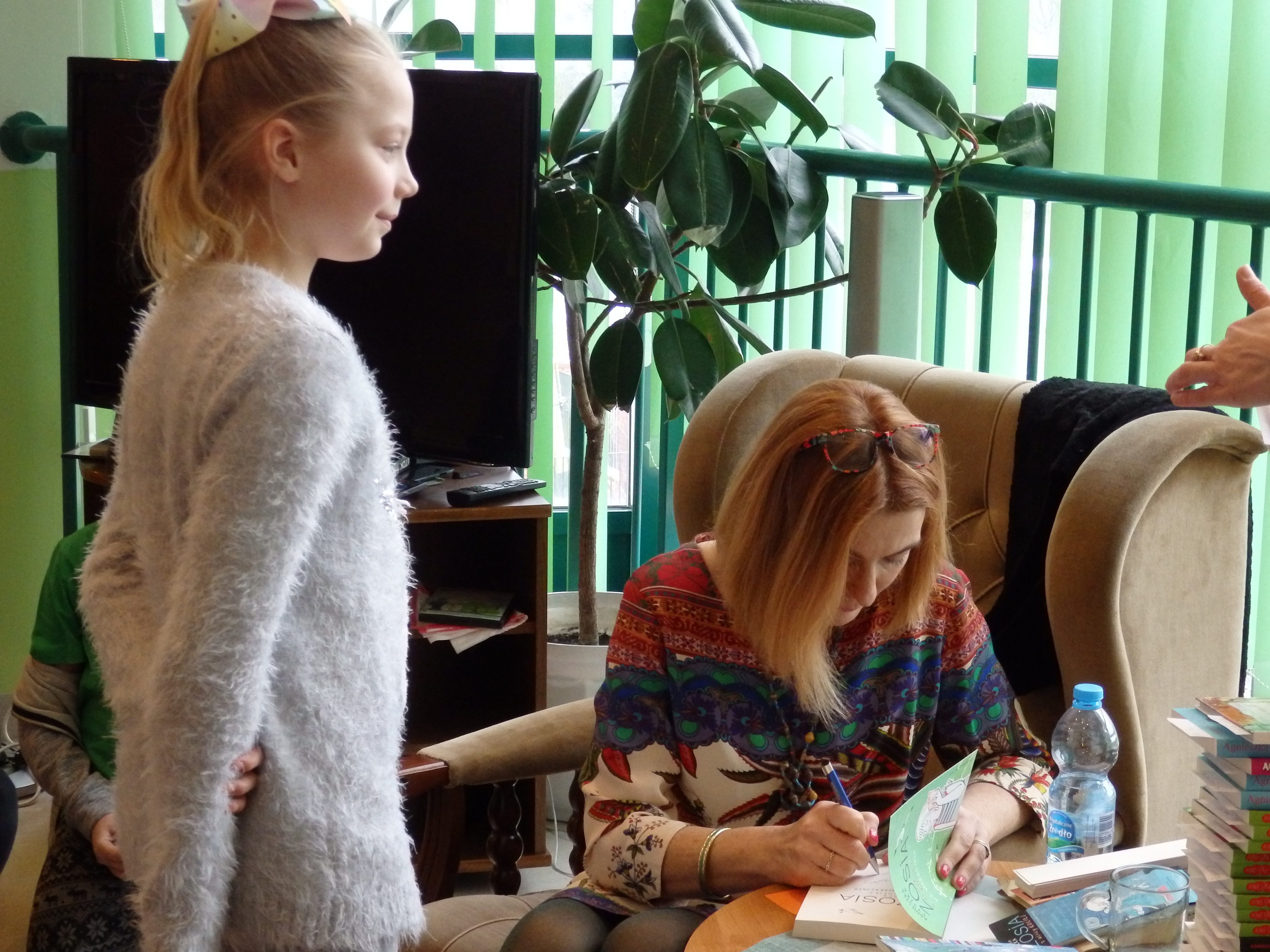 Dnia 9.02.2018r Biblioteka Publiczna im. Medarda Downarowicza zaprosiła do biblioteki szkolnej Szkoły Podstawowej nr 3 w Łochowie autorkę książek dla dzieci Agnieszkę Tyszkę. Uczestnikami spotkania byli uczniowie klas czwartych. Pani Agnieszka jest autorką licznych powieści, bajek, opowiadań, słuchowisk radiowych i scenariuszy teatralnych. Najbardziej znana jej seria to: „Zosia z ulicy Kociej”i książki: „Kredens pod Grunwaldem”, „Mejle na miotle”, ”Nawijka na skajpie”, „Róże w garażu”, „Deszczowa zagadka inspektorta Nielubca”. Dzieci zasypały pisarkę pytaniami dotyczącymi jej życia i twórczości. Autorka zachęcała do czytania książek oraz opowiadała skąd czerpie pomysły i jak zbiera materiały do swoich powieści. Na zakończenie pisarka chętnie składała autografy w zakupionych przez dzieci książkachi na zakładkach, które rozdała uczestnikom spotkania.