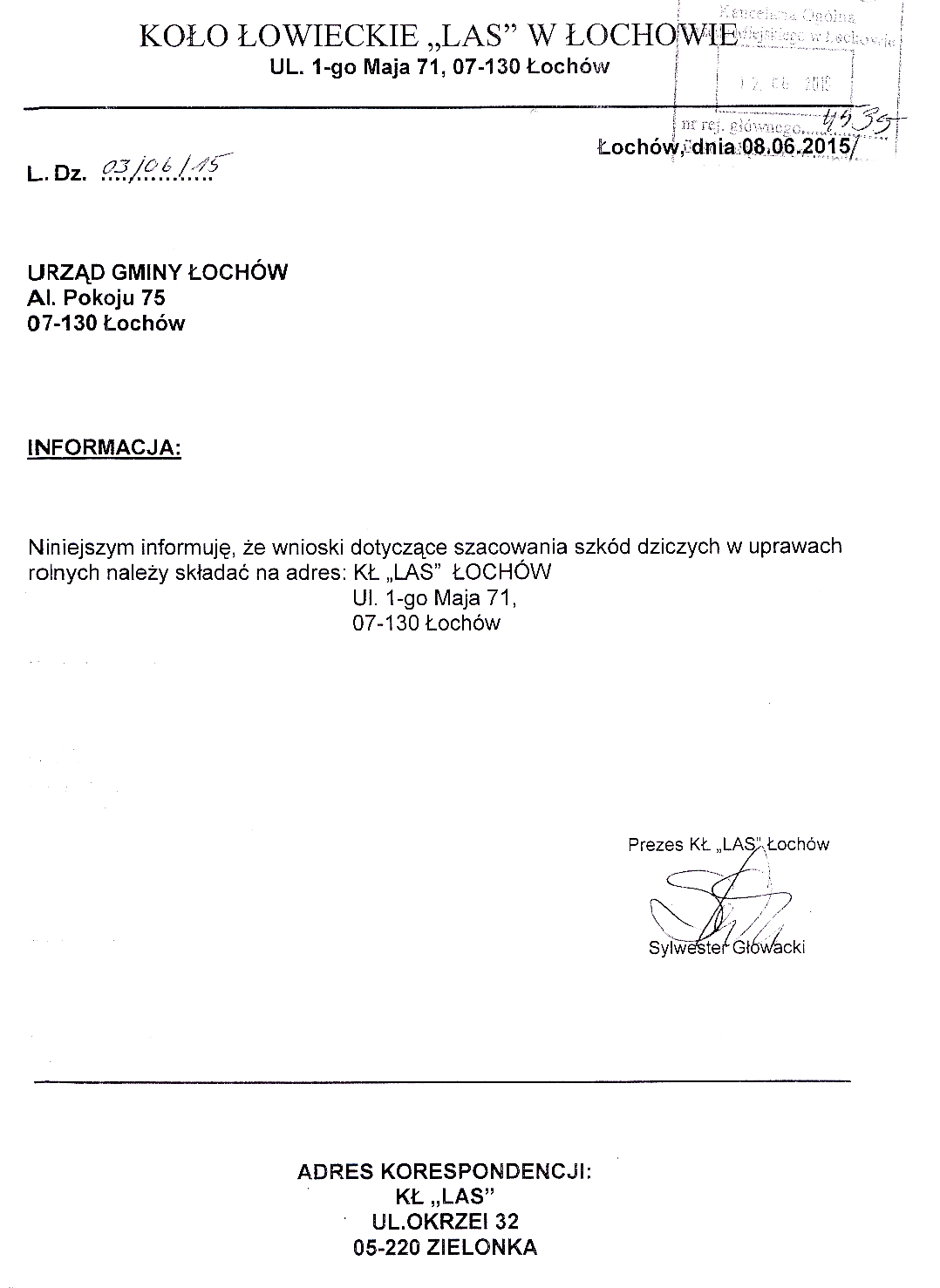 Wnioski dotyczące szacowania szkód dziczych w uprawach rolnych należy składać na adres: KŁ „LAS" ŁOCHÓW, Ul. 1-go Maja 71, 07-130 Łochów.