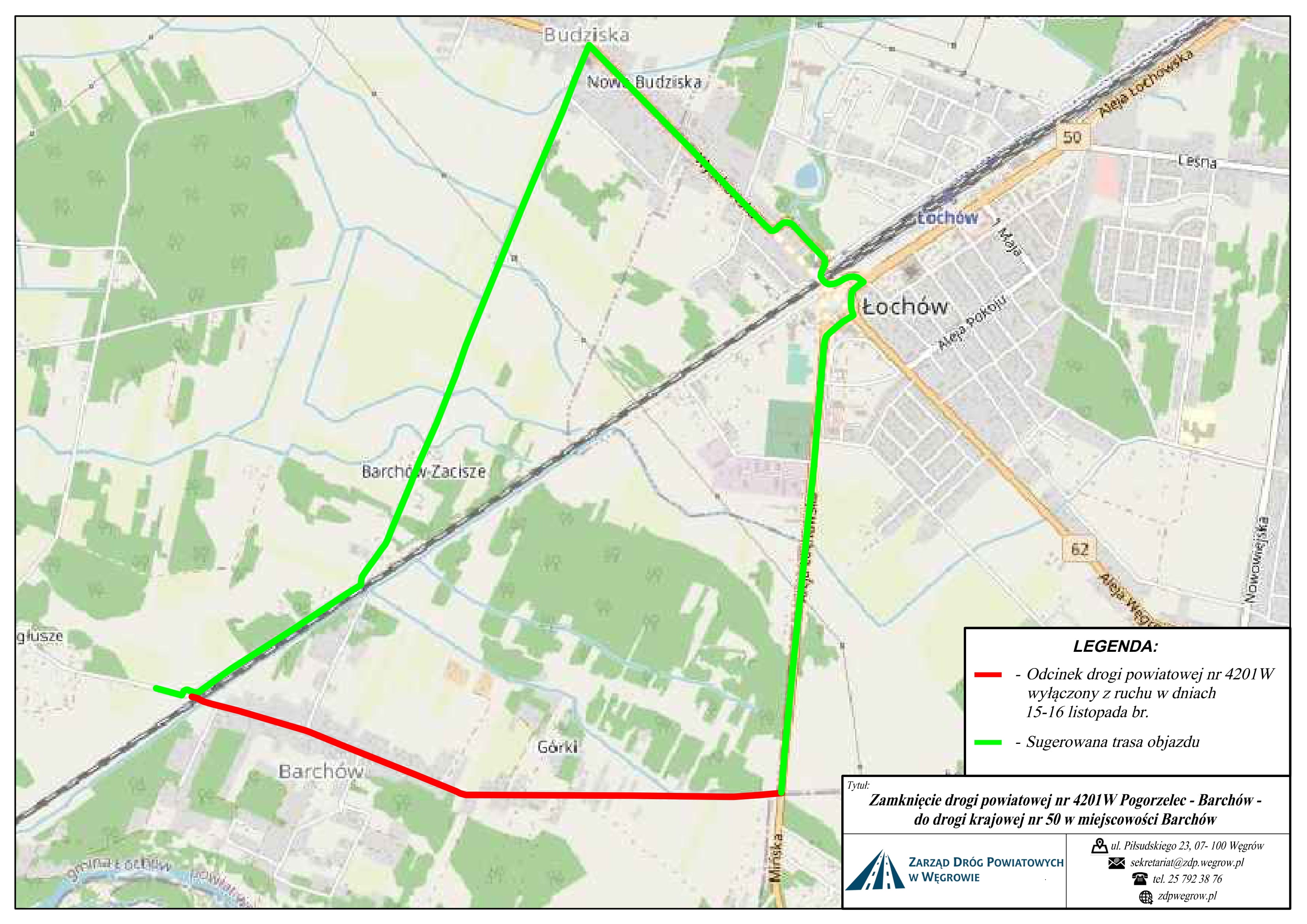 Objazd od Kalisk do Łochowa oraz w odwrotnym kierunku zalecany jest przez miejscowość Budziska.
